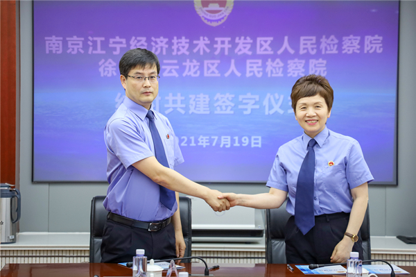 在随后的座谈会上,云龙区检察院党组书记、检察长吕青与江宁开发区检察院分党组副书记、副检察长胡俊分别介绍了两地辖区情况和检察院基本情况,重点就两地检察机关特色亮点工作进行了交流,签订了结对共建协议书。