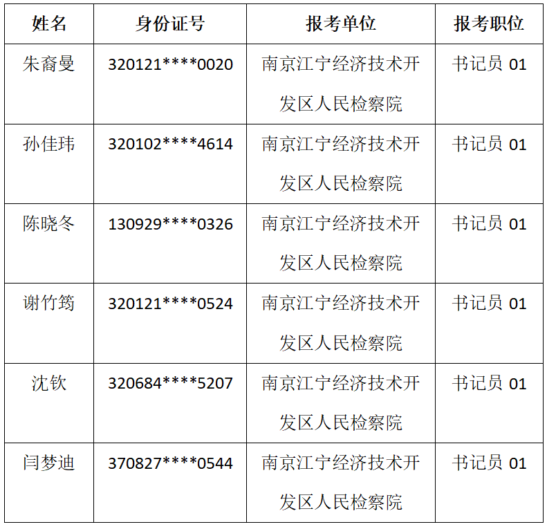 以下同志拟聘用为南京江宁经济技术开发区人民检察院书记员: