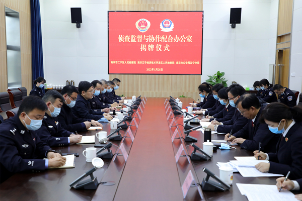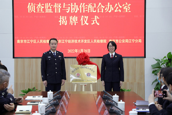 为贯彻落实最高检、公安部联合印发的《关于健全完善侦查监督与协作配合机制的意见》精神,1月28日上午,南京江宁经济技术开发区人民检察院与江宁区公安分局共同举行侦查监督与协作配合办公室揭牌仪式。江宁区委常委、政法委书记庞志贵,江宁区副区长、公安分局局长李鹏,江宁开发区检察院分党组书记、检察长薛薇,江宁区检察院党组书记、代检察长胡彬华及相关部门的分管领导和部门负责人参加揭牌仪式。